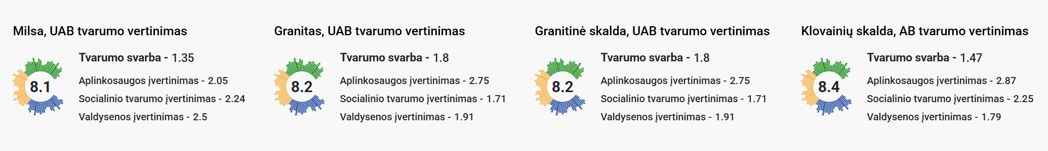 Pagal šį vertinimą „Milsa“ grupės įmonės – UAB „Milsa“, UAB „Granitas“, UAB „Granitinė skalda“ ir AB „Klovainių skalda“ – pasiekė 8,1–8,4 balų tvarumo indeksą, patvirtinantį tvirtą mūsų veiklos lygį tvarumo srityje.